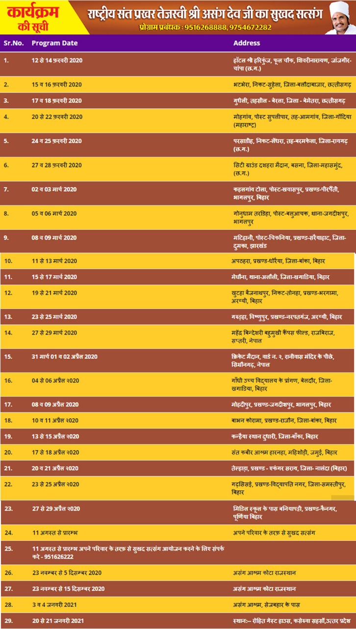 | 37. | 20 से 22 अप्रैल 2026 | श्री कृष्ण नगर कन्हैली खाब्दह प्रखंड - नरपतगंज, जिला - अररिया (बिहार) पिन नंबर - 854318 | 40 कि.मी | 1घंटे |